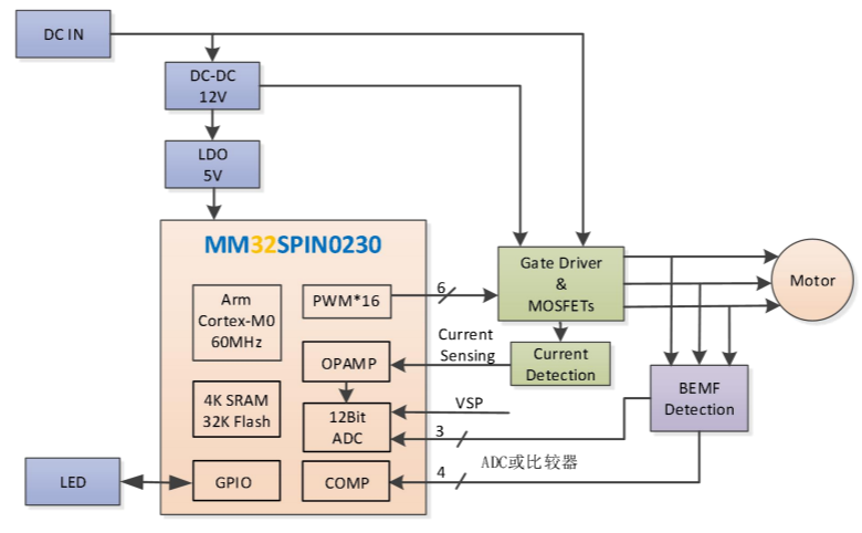 下圖是MM32SPIN0230無感方波方案硬件框圖。